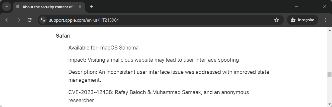After reporting the issue, the vulnerability was addressed by the Apple and CVE-2023-42438 assigned.