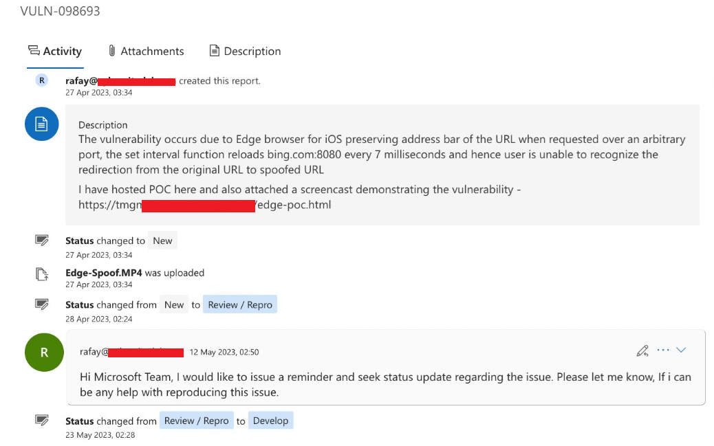 Similar to Safari, Microsoft Edge Browser for IOS was also found vulnerable to an address bar spoofing attack. The repot was submitted to Microsoft MSRC program.
